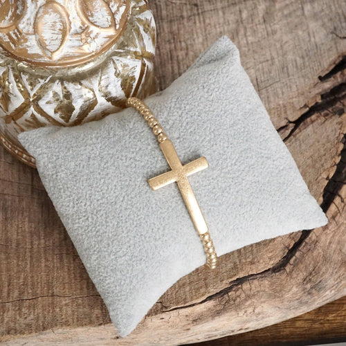 Minimal Cross Stretchy Bracelet in Worn Gold tone with Ball Beads