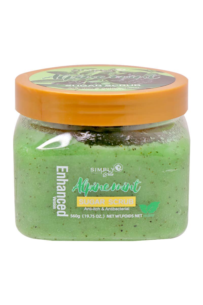 Simply Bella SIB1004 Alpine Mint Exfoliating Sugar Scrub. A refreshing, therapeutic skincare treatment designed to gently exfoliate while soothing and protecting the skin. Infused with the cooling essence of alpine mint, this invigorating scrub provides powerful antibacterial and anti-itch benefits, making it ideal for both face and body care. The fine sugar crystals work to effectively remove dead skin cells, unclog pores, and smooth rough patches without causing irritation, leaving the skin soft, polished, and revitalized. Alpine mint delivers a clean, crisp sensation that calms itching, soothes irritated areas, and helps reduce redness and inflammation. Its natural antibacterial properties help combat acne-causing bacteria and support clearer, healthier skin.